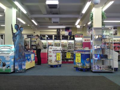 und betrat die größte Videothek meines Lebens (eine Etage so groß wie eine ganze Videothek nur für Fressalien, eine mit Familien-, eine mit Erwachsenenunterhaltung, boah!)